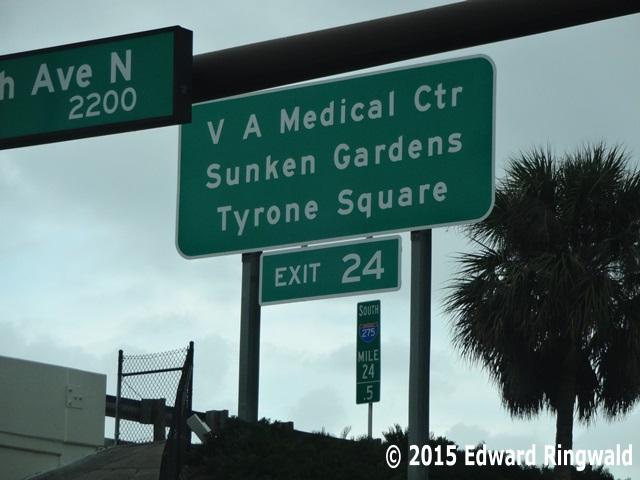 If you are wondering why there is signage directing motorists to 22 Av N for the VA Bay Pines Medical Center when in fact it would be more quicker to use 38 Av N, that is another good question! For those headed to the VA Bay Pines Medical Center from the south 22 Av N would be a logical choice as it would take you to Tyrone Blvd N, then northwest on Tyrone Blvd N (which changes to Bay Pines Blvd N at Park St N) to the VA Hospital. However, I cannot understand why those headed to the VA Bay Pines Medical Center from the north are being asked to use 22 Av N instead of 38 Av N which is a quicker route: According to a Dr. Delay article in the St. Petersburg Times the reason the VA Medical Center at Bay Pines could not be signed is that Federal guidelines (the Manual of Uniform Traffic Control Devices, the Bible of all traffic sign standards in the United States and so adopted by the Florida DOT) call for up to two destinations on a guide sign and 38 Av N is at the two destination limit. The two destinations on 38 Av N on southbound Interstate 275 are Madeira Beach and Redington Beach.