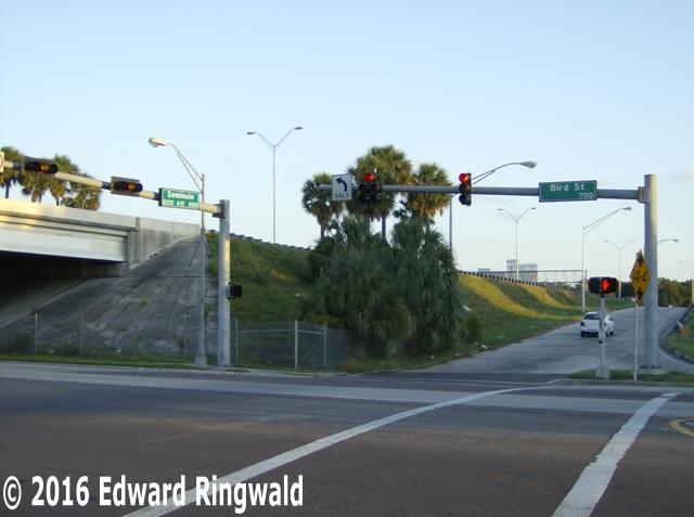 Both Bird Street and Waters Avenue are connected by two one way side streets, Lamar Avenue for northbound exiting traffic and Seminole Avenue for southbound entering traffic.